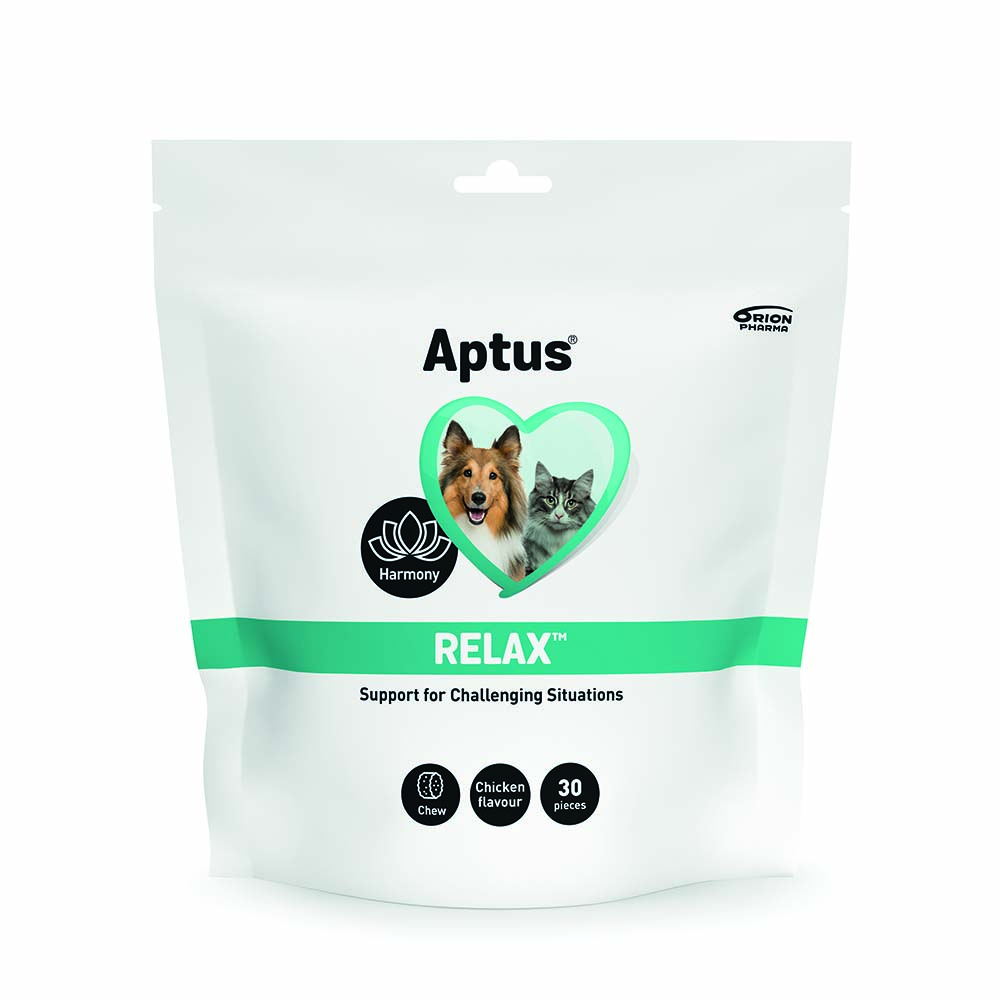 Aptus Relax kan bidra til en roligere oppførsel hvis hunden eller katten din er urolig eller utrygg. Anbefales til for eksempel veterinærbesøk, reiser, separasjon fra eier, negleklipping, torden/fyrverkeri.